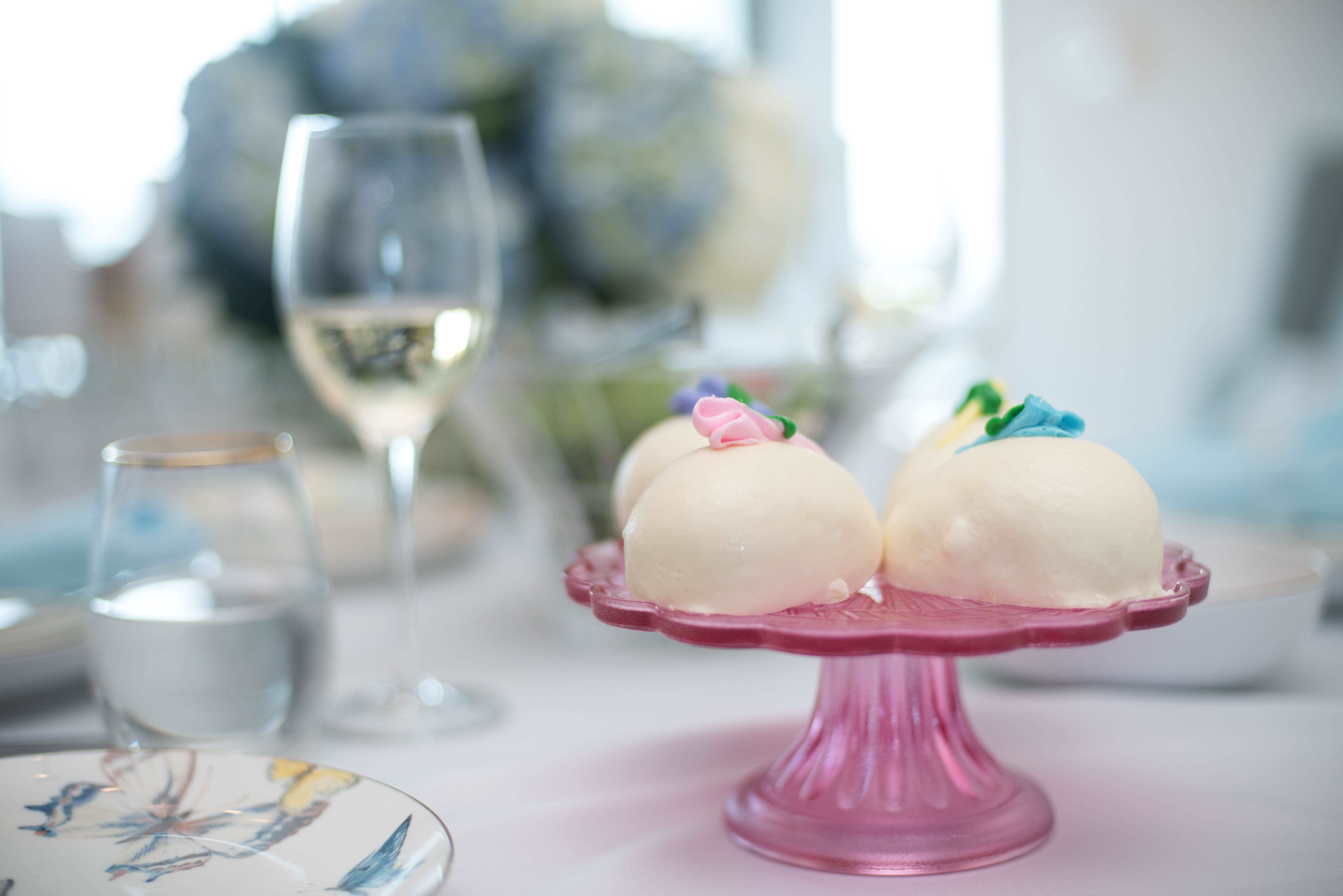 The pink cake stand is something inexpensive I found at Target but have linked another one here and a few others below. The gold rimmed plates, bowls and glasses came from West Elm. These pretty egg cakes came from Fresh Market…which tasted as good as they look. For floral arrangement ideas see this DIY post.